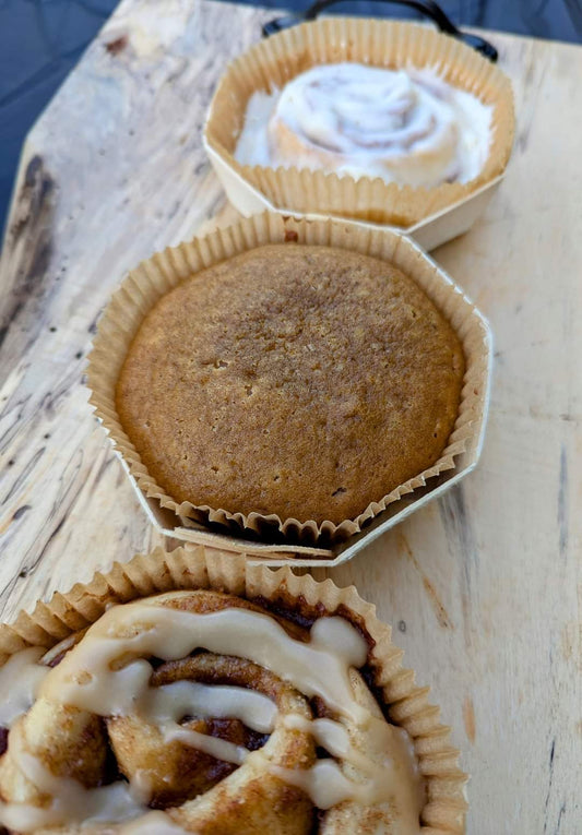 Pumpkin Cinnamon Rolls with Maple Cream Cheese Icing - 5 total served in our classic wooden tray